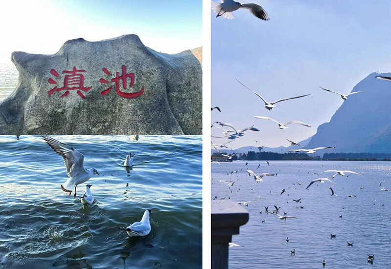 11月4日中午,旅行團乘機順利抵達四季如春的昆明,乘車前往滇池大壩。每年11月至來年3月滇池海埂公園總會聚集成千上萬只來此過冬的紅嘴鷗,在湖面上翻飛的紅嘴鷗成為滇池冬季的一大景觀。