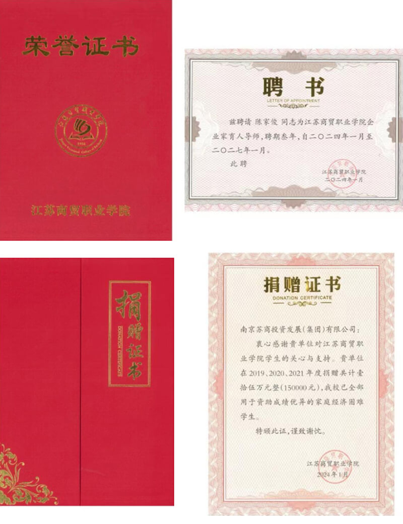 ↑馮志明書記(左)為陳家俊董事長頒發(fā)榮譽證書和“蘇商獎學金”捐贈證書
