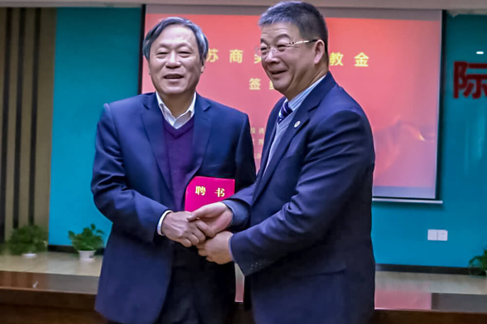 儀式上江蘇商貿(mào)職業(yè)學(xué)院正式聘請(qǐng)陳家俊董事長(zhǎng)為客座教授,并頒發(fā)了聘書。