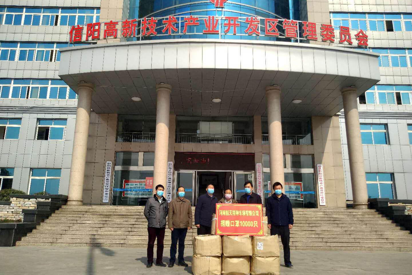 ↑疫情發(fā)生以后,蘇商集團董事長陳家俊先生委托子公司河南航天特種車輛有限公司第 一 時間向河南信陽高新技術(shù)產(chǎn)業(yè)開發(fā)區(qū)管委會捐贈8000只韓國KF94口罩和2000只一次性醫(yī)用口罩,助力革命老區(qū)疫情防控工作。