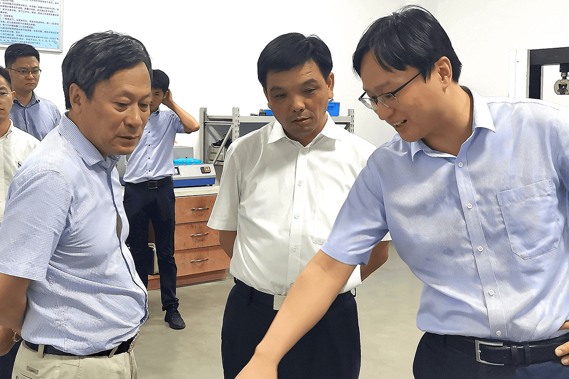 ↑蘇商集團(tuán)陳家俊董事長(左)和副總經(jīng)理陳寅同志(右)陪同南京江寧濱江開發(fā)區(qū)黨工委萬振華書記(中)參觀南京金城軌道公司產(chǎn)品實(shí)驗室。