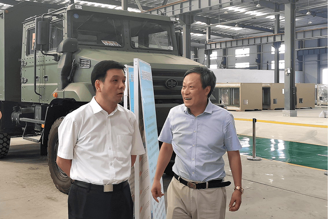 ↑蘇商集團(tuán)陳家俊董事長(右)陪同南京江寧濱江開發(fā)區(qū)黨工委萬振華書記(左)參觀南京金城軌道公司生產(chǎn)車間。