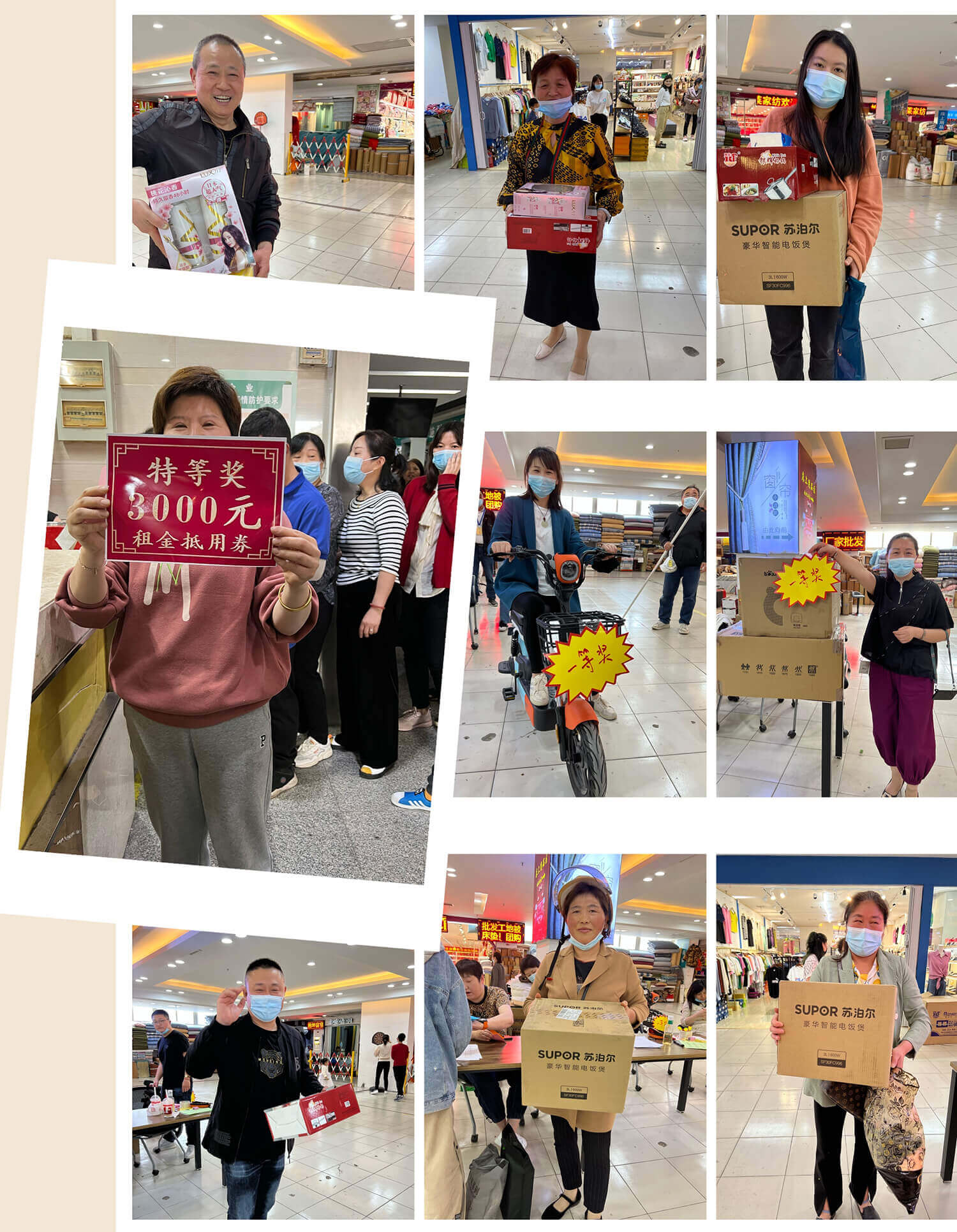 在幸運抽獎區(qū),拼手氣大賽的隊伍排成一字長龍陣,人氣集聚、場面火爆。本次特等獎為三千元消費券,其他獎項還有品牌電動自行車、雙立人鍋具套裝、蘇泊爾電飯煲、不銹鋼奶鍋、力士洗發(fā)套盒、清揚洗發(fā)水、維達(dá)抽紙等,品項豐富,獎品充足,只待您的好運來!